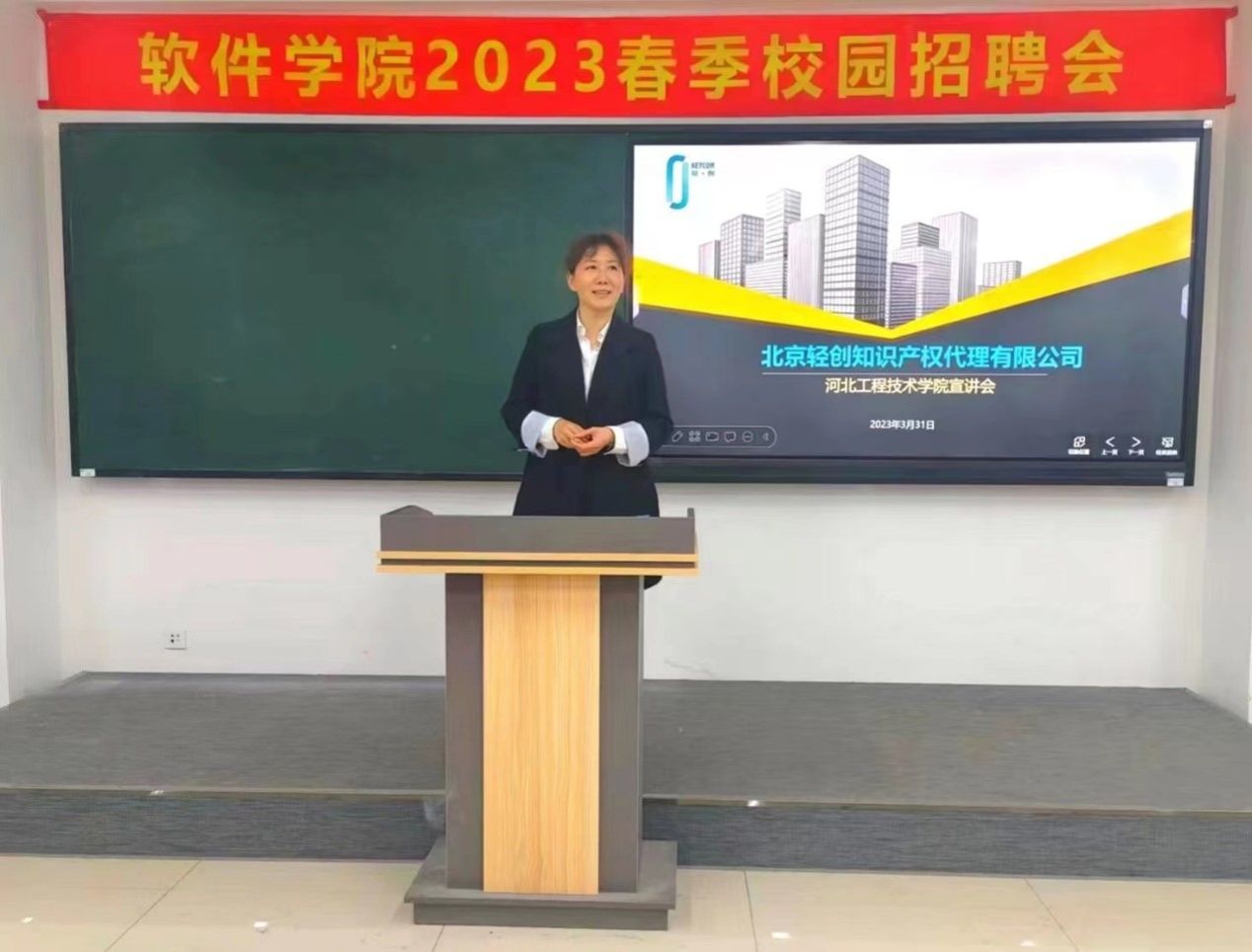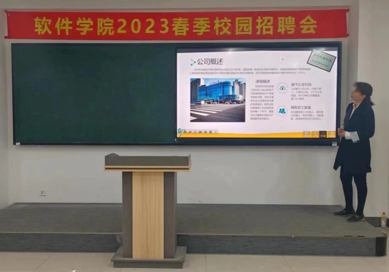 当下,正是用人单位招聘和大学生求职的旺季,为持续做好就业创业服务工作,促进高校毕业生顺利就业,2023年3月31日中午,软件学院在知行楼2-1教室举办2023春季校园招聘会,特意邀请北京轻创知识产权代理有限公司进行专场招聘宣讲。