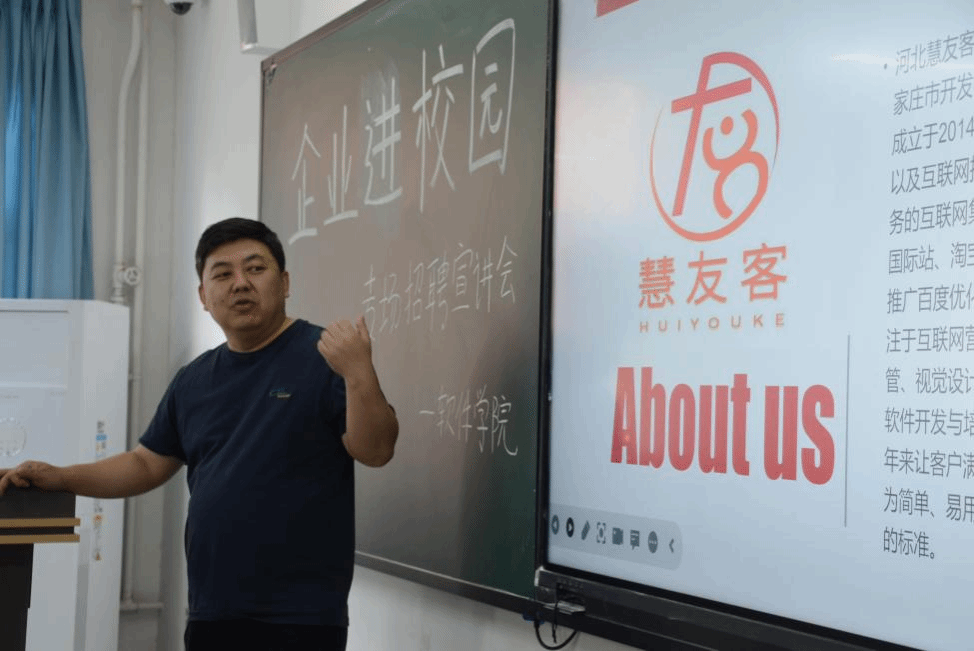 为切实做好2024届毕业生就业工作,进一步加强校企合作,为学生求职和用人单位招聘搭建平台,促进学生与企业之间的双向选择,2023年10月31日beat365英国官网网站软件学院邀请河北慧友客信息科技有限公司在次教111举行“企业进校园”专场招聘宣讲会。会议伊始,由主持人介绍了河北慧友客信息科技有限公司代表人,并表示了热烈的欢迎。