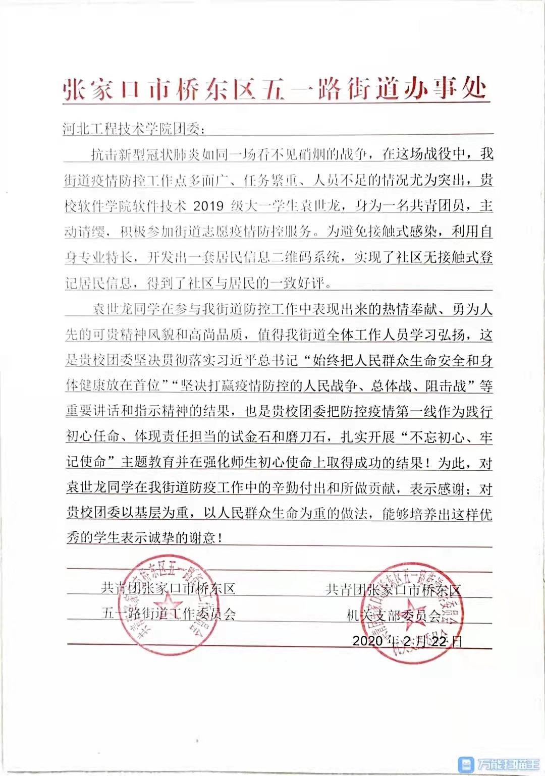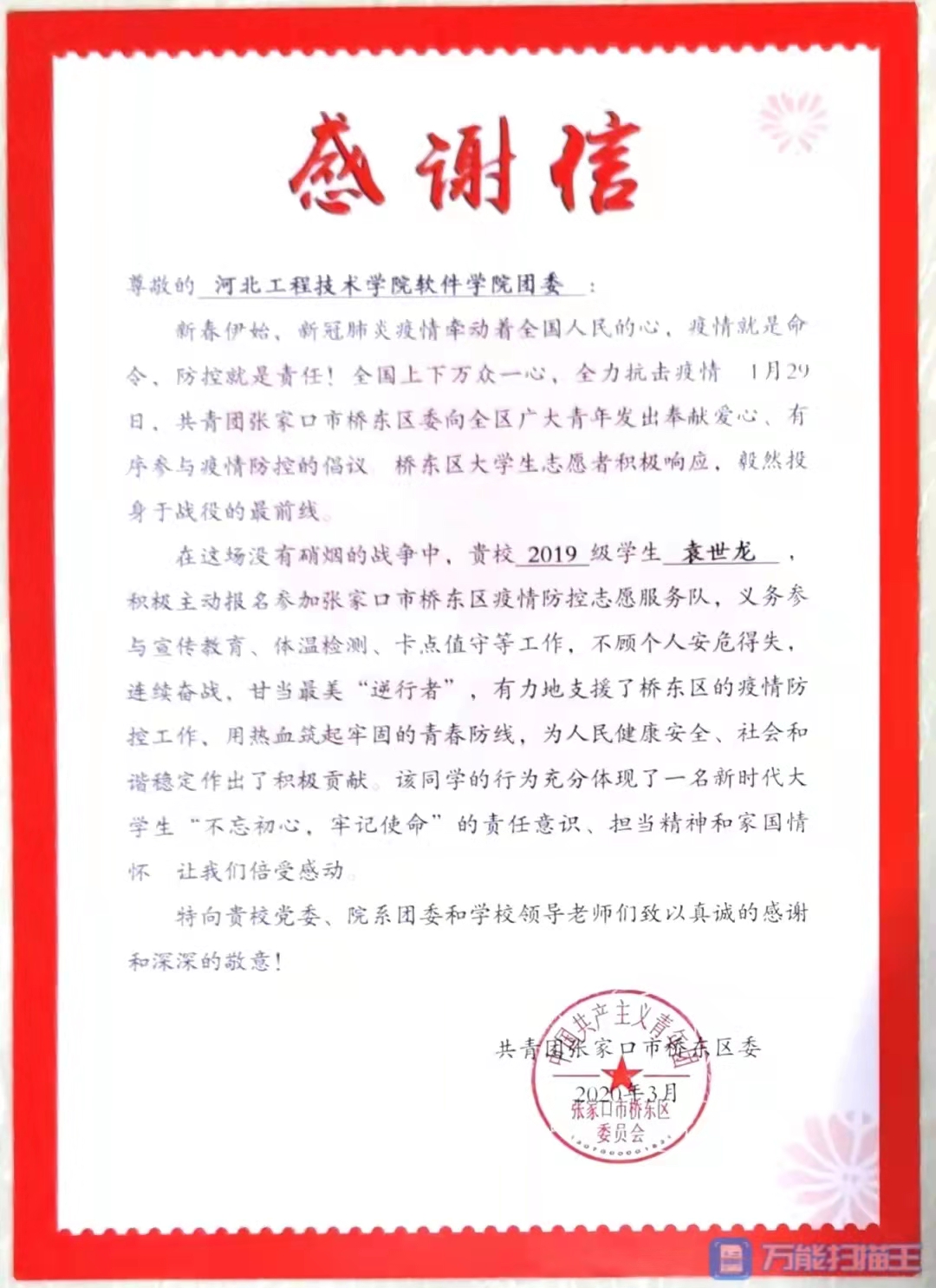 袁世龙,男,beat365英国官网网站软件学院2019级软件技术专业学生。在校期间认真学习,积极参加学校组织的各类活动。在假期主动参加志愿服务活动,受到当地团委的表扬,并提供了共青团张家口市桥东区委工作岗位。