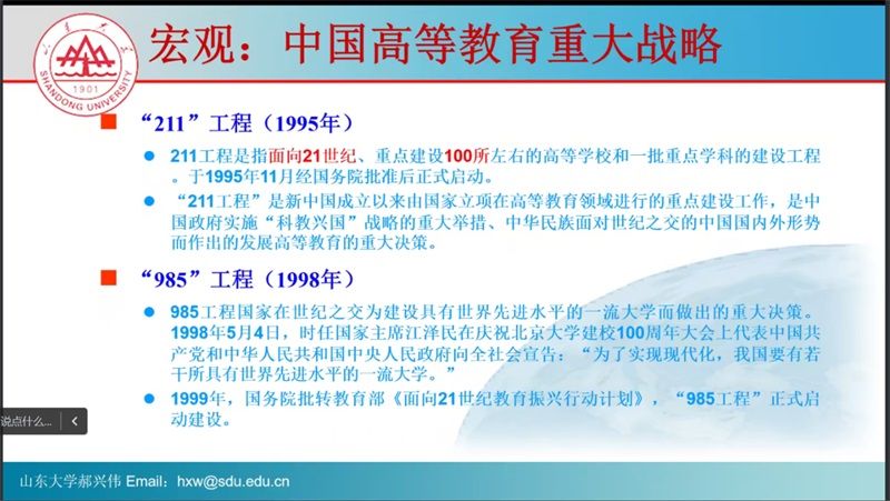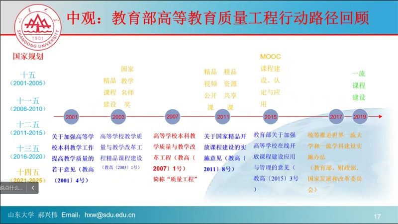 第二,郝教授通过这些年工作的经验,梳理了我国高等教育发展战略与教学改革历程。从宏观看,中国高等教育重大战略主要有211工程、985工程;从中观看,教育部高等教育质量工程行动主要有精品课程、教学名师、资源共享课、视频公开课、慕课、一流课程建设、四新建设等;从微观看,结合山东大学计算机通识教育课程建设成果,主要有国家精品课程建设、国家精品资源共享课建设、慕课建设、教材建设。