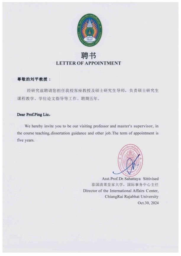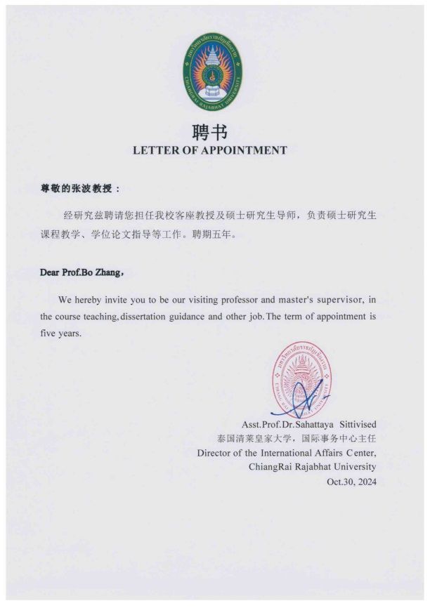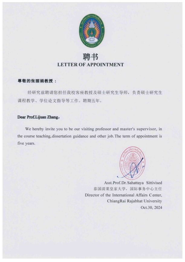 为积极响应国家共建“一带一路”教育行动的号召,深化beat365官网国际交流与合作的战略部署,推动高水平教育对外开放,beat365官网与泰国清莱皇家大学共同设立“硕士研究生联合培养中心”。经教师个人申请、各教学单位初审、校领导复审、泰国清莱皇家大学评议,2024年10月30日起,beat365官网张波、冯丽佳、张丽娟、刘平4名教师被聘任泰国清莱皇家大学硕士研究生导师,聘期五年。