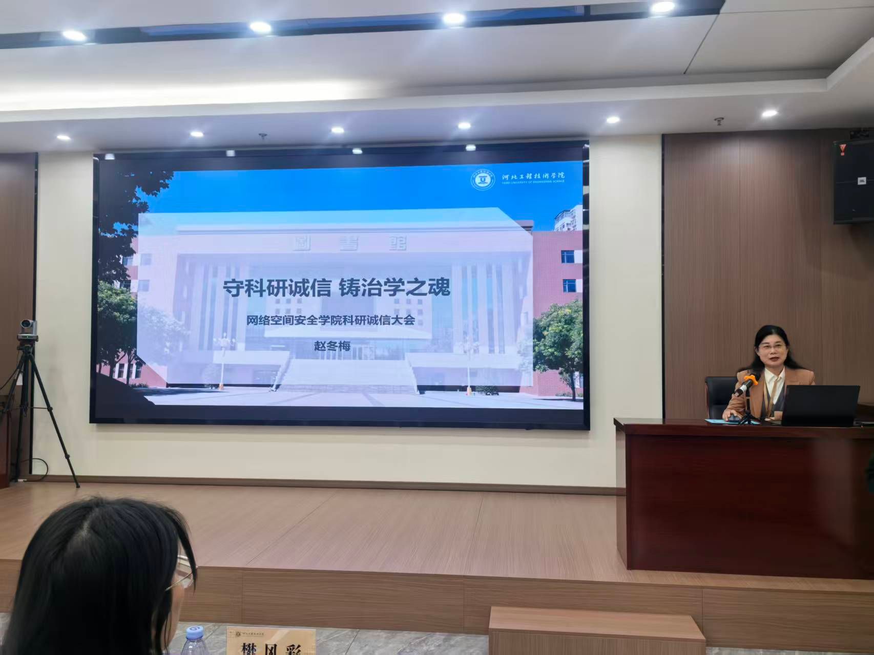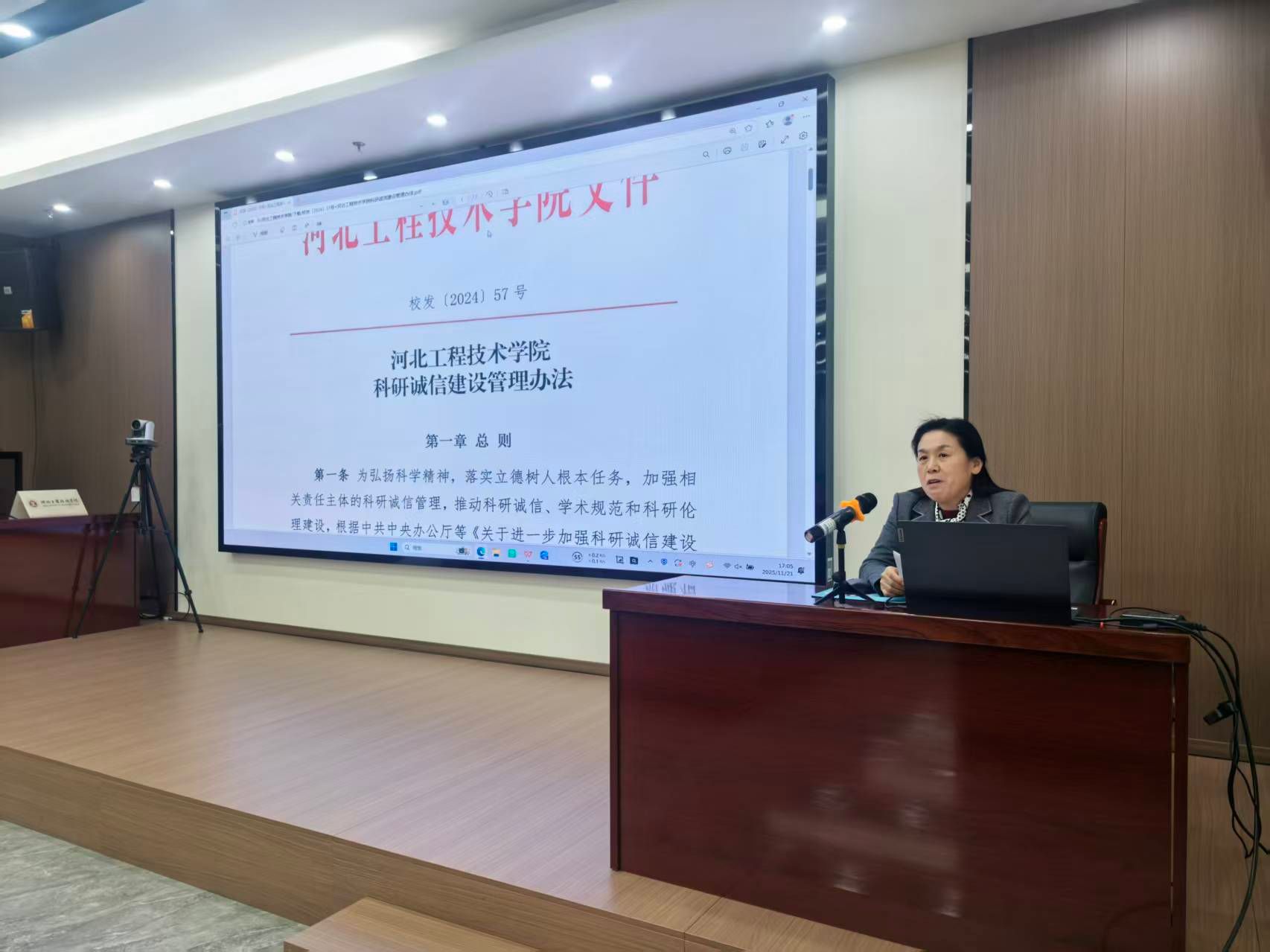 随后,学院院长赵冬梅教授上台,为在场教师深入解读科研诚信的内涵与行动指南。赵院长结合学术研究中的实际案例,从数据真实性、成果署名规范、学术不端行为界定与防范等方面展开详细阐述,强调科研诚信是学术研究的生命线,更是每位科研工作者的立身之本。她呼吁全体教师将科研诚信内化于心、外化于行,在学术道路上坚守初心、行稳致远。现场教师认真聆听,不时记录要点,对科研诚信有了更清晰的认知和更深刻的理解。