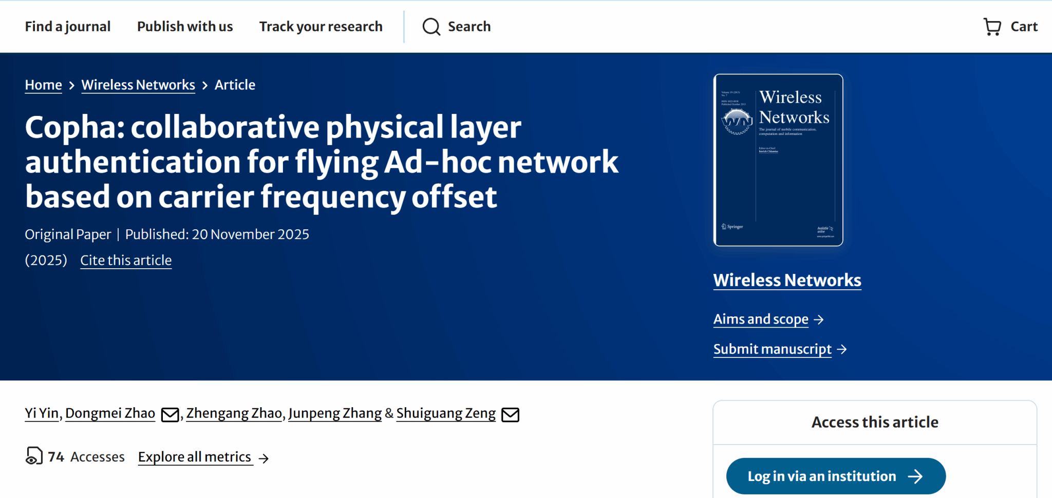 近日,beat365英国官网网站专任教师尹伊,在无线网络安全领域研究取得重要进展。其题为《Copha: collaborative physical layer authentication for flying Ad-hoc network based on carrier frequency offset》的学术论文成功发表于国际知名期刊《Wireless Networks》(ISSN:1022-0038),为飞行自组网安全认证技术创新提供了全新解决方案。