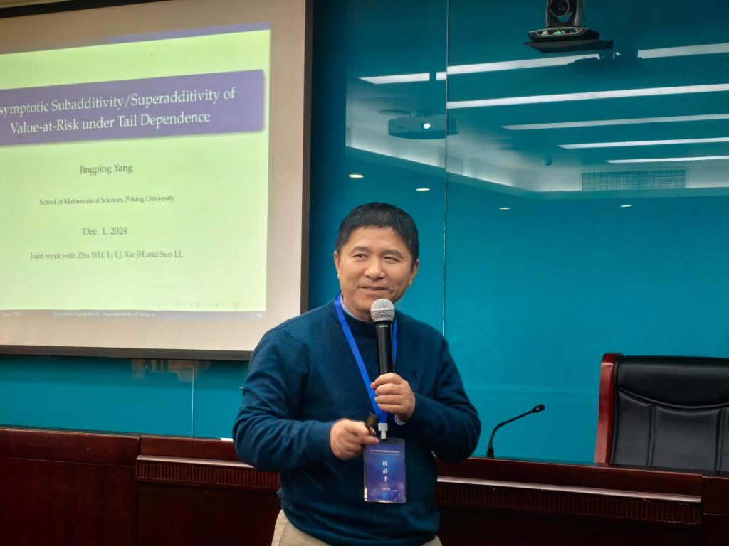 北京大学杨静平教授作了题为“Asymptotic subadditivity/superadditivity of Value-at-Risk under tail dependence”的主旨演讲。杨老师在报告中探讨了尾部相依多风险的VaR值渐近次可加性或超可加性。他引入了尾部凹序来比较尾部风险,从而给出当个体风险在尾部凹序意义下小于正则变化随机变量时VaR的渐近次可加性以及超可加性的充分条件。他还对比了共享同一尾部耦合函数的多重风险的VaR特性,并得出了风险渐近分散化比率。最后,他还介绍了实证分析结果。