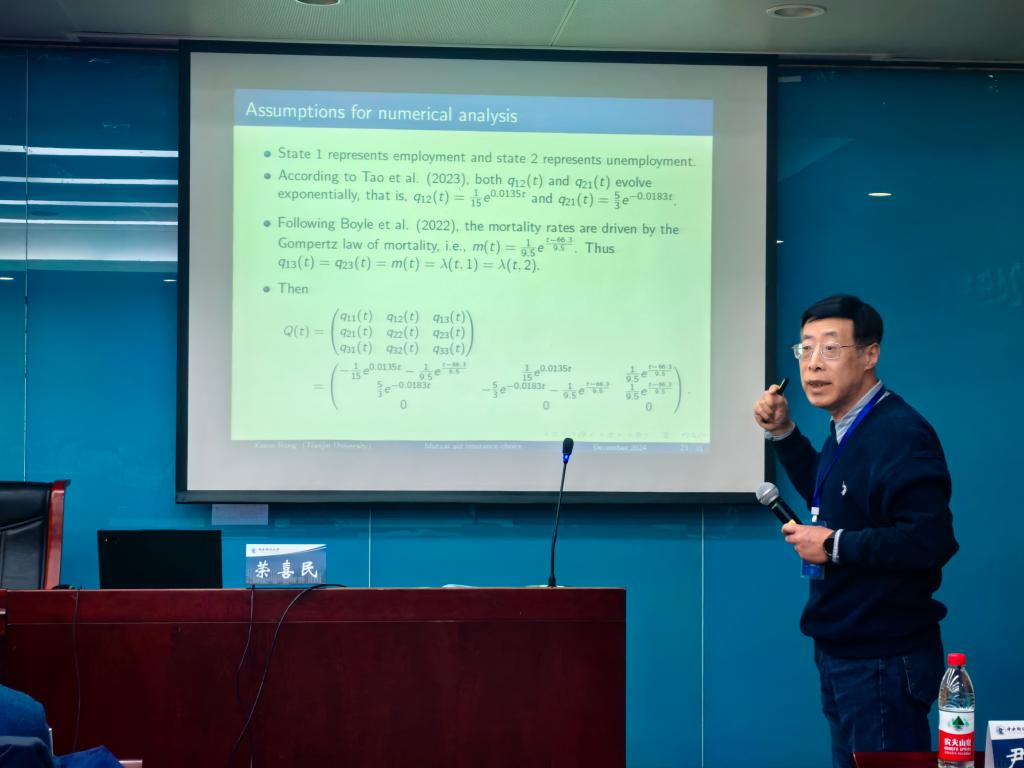 天津大学荣喜民教授作了题为“Mutual aid insurance with a three-state Markov chain”的报告。荣老师指出,互助保险是一种集体性保险,投保人共同分担他们可能面临的死亡或者疾病等风险。他的报告将人分为三个状态:健康、需要护理和死亡,并通过一个非齐次马尔可夫链刻画状态间的转变。他以最大化个人的期望效用为目标,分析一个含互助保险、人寿保险需求和消费的最优决策问题。他利用HJB方程得到最优决策的显式表达式。最后,他通过一个数值例子说明互助保险有其存在的价值。
