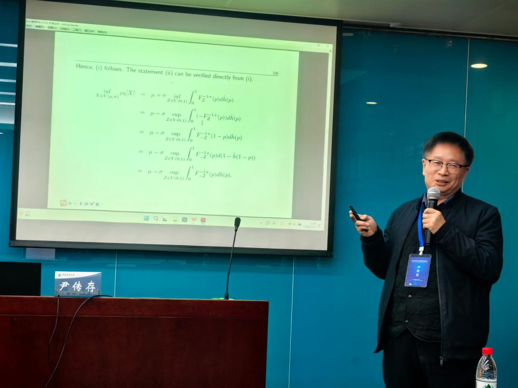 曲阜师范大学尹传存教授发表题为“Optimizing distortion risk measures under partial information constraints”的主旨演讲。尹老师讨论在只有基础分布的部分信息时一般类别的扭曲风险度量的最好和最坏情况。基于一阶矩和二阶矩以及对称性/单峰性的一些形态信息,他导出了一般类别的扭曲风险度量下限和上限的显式表达式。他提出的方法为求解扭曲风险度量的极值问题提供了一致的分析框架。