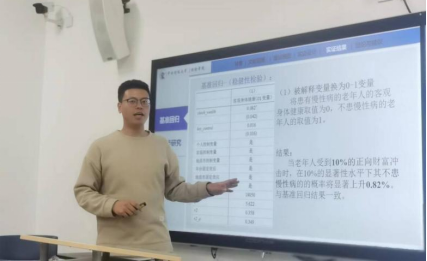 林书齐同学于12月2日在“CHARLS专场(二)”分会场汇报论文。林书齐同学根据论文章节从研究背景、研究设计等四个方面进行了汇报。该文章指出,有关多层次医疗保障体系的定量研究还比较少见,因此该文从多层次医疗保障体系为切入点,聚焦于多层次医疗保障的参与程度以及医疗保障具体类别对中老年人健康水平的影响进行实证研究,为进一步深入研究社保商保之间的关系和多层次医疗保障体系的构建提供依据。