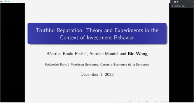 2023年12月1日下午,由必赢nn699net官网举办的风险管理与保险论坛(2023年度)第九讲《Truthful Reputation: Theory and Experiments in the Context of Investment Behavior》在线上顺利举行。本次讲座邀请的主讲人王斌博士毕业于巴黎第一大学(CNRS-CES),她的研究方向为行为金融与实验经济学,研究课题主要聚焦于金融预测、投资与融资以及声誉机制。王斌博士目前是多篇期刊的匿名审稿人,并多次在国内外知名学术会议报告论文。