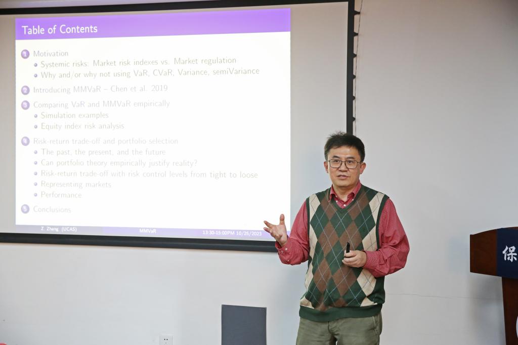 2023年10月25日下午,必赢nn699net官网、中国精算研究院邀请来自中国科学院大学经济与管理学院的张正军教授做客学院第三期双周论坛,作了题为“Tail Risk Measures in Portfolio and Financial Investing: The Inadequate,The Specious, and The Balanced”的报告,并分享最新研究成果。张志军教授是中国科学院大学统计与数据科学系系主任,中国科学院预测科学研究中心副主任,原美国威斯康辛大学统计系终身教授和副系主任。本次双周论坛由副院长郑苏晋主持,学院教授和学生踊跃参加。