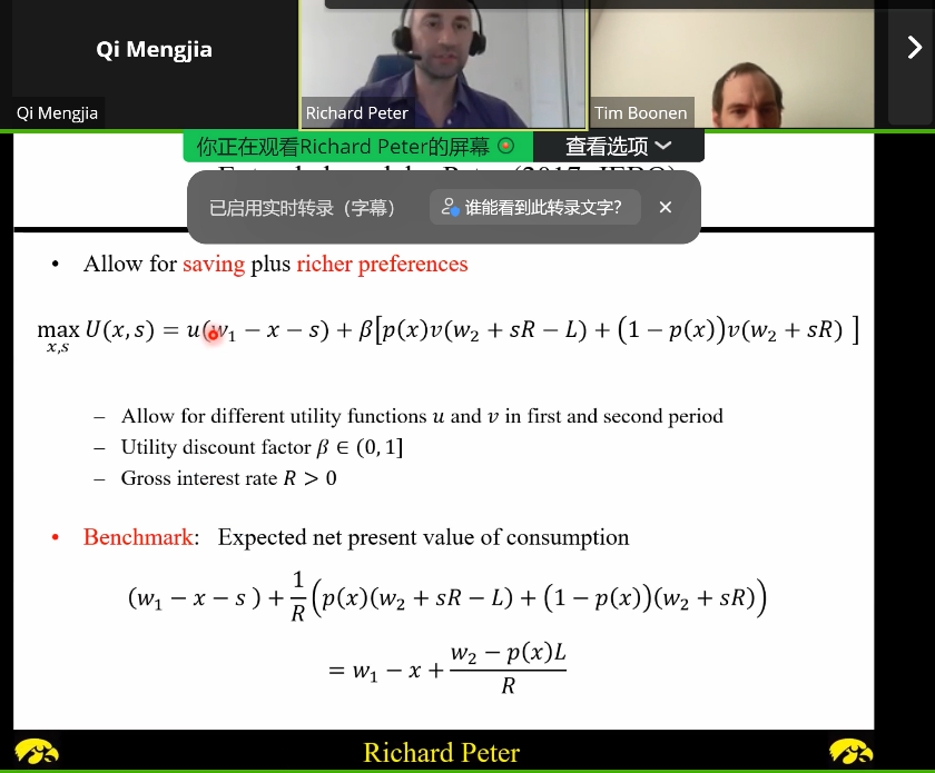 课程第三天讨论了两期模型中的最优自我保护问题。这个模型考虑了个体在两个时间区间面临的风险,以及他们如何在两期模型上做出最优的自我保护决策。Richard Peter教授深入介绍了行为经济学中的最优自我保护问题。他强调了个人的行为和偏好在决定最优自我保护策略时的重要性。行为经济学考虑到个体在面对风险时可能存在的偏差和决策失误,因此对最优自我保护问题的研究更加贴近实际情况,并为我们理解保险市场的运作机制提供了新的视角。