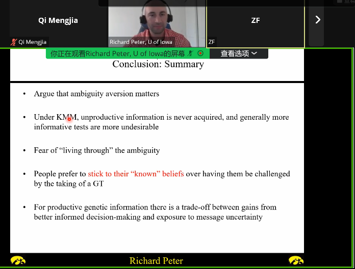 为活跃学院的学术氛围,加强对研究生和青年教师的学术培养,应中国精算研究院池义春研究员邀请,美国爱荷华大学金融系的Richard Peter副教授于2023年7月24日至7月27日,通过ZOOM会议进行了主题为“Topics in risk and insurance economics”的暑期课程。课程涵盖了保险市场的逆向选择、信息作为内生变量时的决策、自我保护与自我保险、高阶风险及其经济学分析等风险和保险经济学中的经典论题。