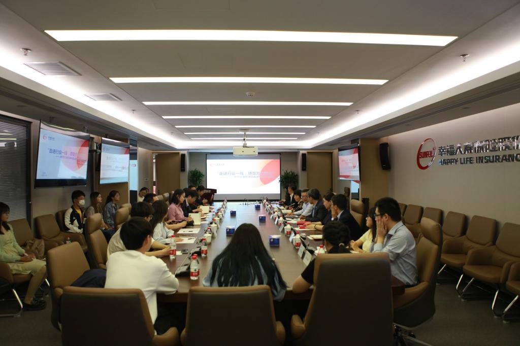 为积极响应教育部、学校要求,深入开展“访企拓岗促就业”行动,2023年5月9日下午,必赢nn699net官网院长周桦、副院长郑苏晋、党委副书记吴越、辅导员及学生代表一行走访了幸福人寿保险股份有限公司。本次活动也是必赢nn699net官网党委开展学习贯彻习近平新时代中国特色社会主义思想主题教育,深入用人单位一线开展调查研究、攻坚克难推动学院发展的重要活动之一。幸福人寿董事长王慧轩、总裁廖定进、人力资源部总经理叶向峰、总经理助理陈伟明、风险管理部总经理王燕、产品部王慧心、个险营销部王琨出席了交流会。