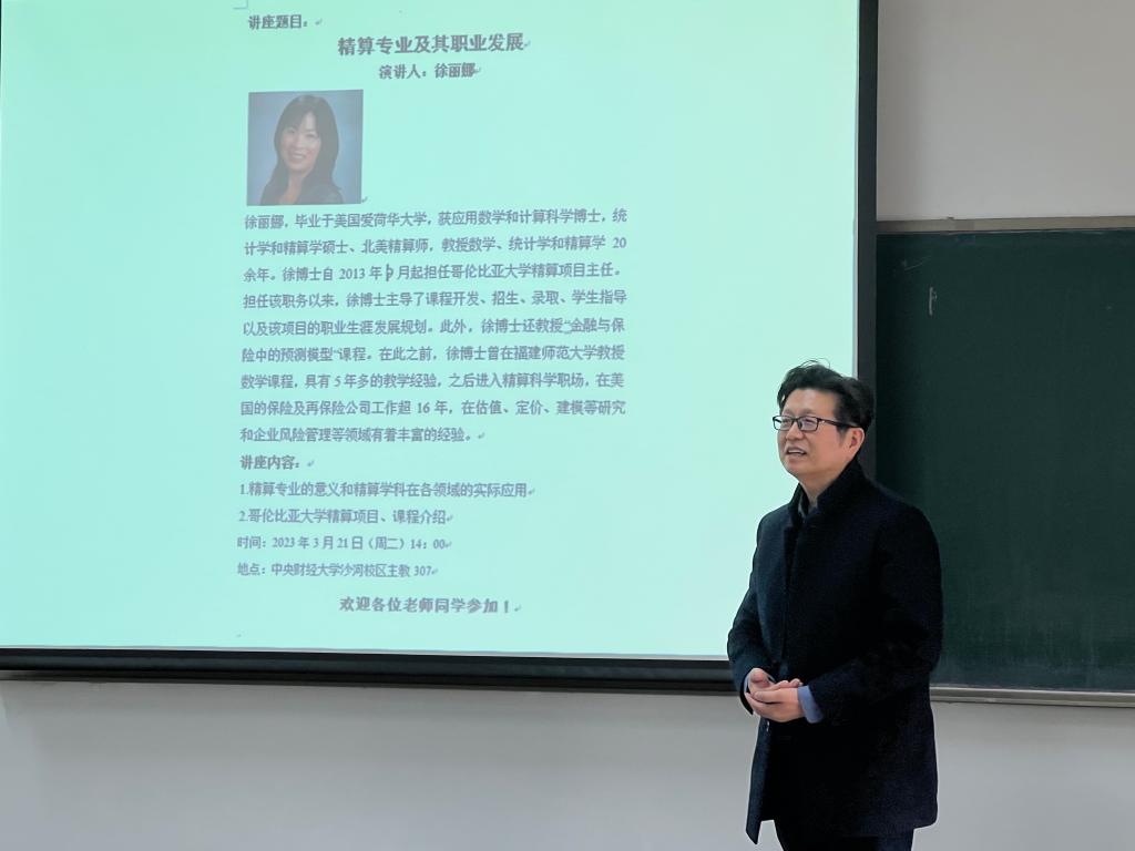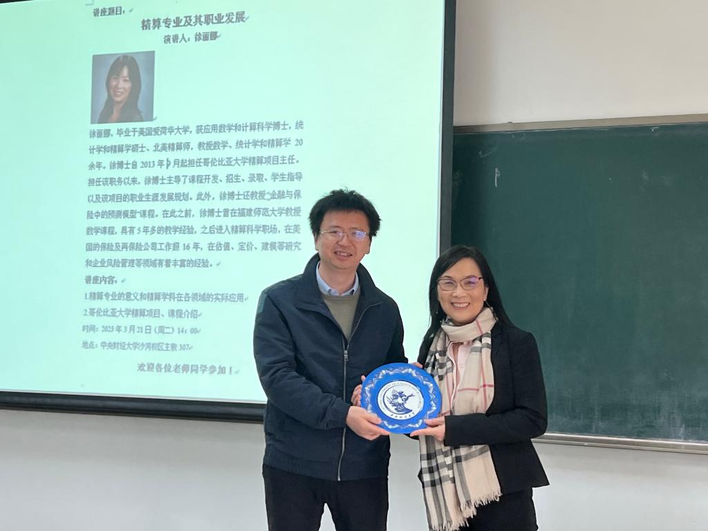 2023年3月21日,美国哥伦比亚大学精算项目主任徐丽娜女士受邀前来必赢nn699net官网,为必赢官网师生带来一场题为《精算专业及其职业发展》的专题讲座。本次讲座由必赢nn699net官网精算科学系主任郑苏晋教授主持;李晓林教授到会,并介绍了徐丽娜女士对中财精算项目工作支持的情况;学院院长周桦教授向徐丽娜女士表达了诚挚感谢,并赠送了学院纪念品。