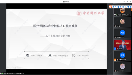 10月28日下午,在学术分论坛上,必赢官网4名教师与8名研究生分别在分会场报告了8篇学术论文。必赢官网陈华教授和王沁雨报告了合作论文《The Impact of Urban-rural Health Insurance Integration on Labor Supply——Evidence from Rural China》,王丽珍副教授和博士生张简荻报告了《疫情冲击对保险业系统性风险的影响研究——基于跨境差异视角的实证分析》,博士生王煜正报告了《“舐犊”抑或“反哺”?——长期照护保险的代际效应》,杨再贵教授和博士生秦少鹏报告了《基金收支平衡目标下的退休年龄调整机制》,博士生徐睿和孟辉研究员报告了合作论文《生存预期对于中老年人商业医疗保险需求的影响——基于感性与理性视角》,陈华教授和杨晓旭报告了合作论文《The Impact of Medical Insurance on Family Financial Transfers》,陈华教授和杨熠飞报告了合作论文《Does Public Health Insurance Crowd Out Private Health Insurance? ——New Evidences from a Quasi Experiment in China》,博士生周佳璇报告了《医疗保险与农业转移人口城市减贫——基于多维相对贫困视角》。对于上述8篇论文,论坛点评人与主持人均给予了细致的点评并与线上师生进行了热烈讨论。此外,各位参会作者还担任论文点评人,对分论坛其他学者的论文进行认真点评与讨论。