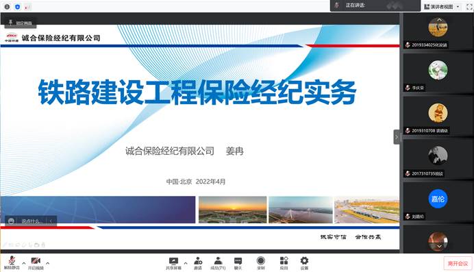 2022年4月15日下午,2022年风险管理与保险论坛第六讲《铁路建设工程保险经纪实务》在腾讯会议平台顺利举行。