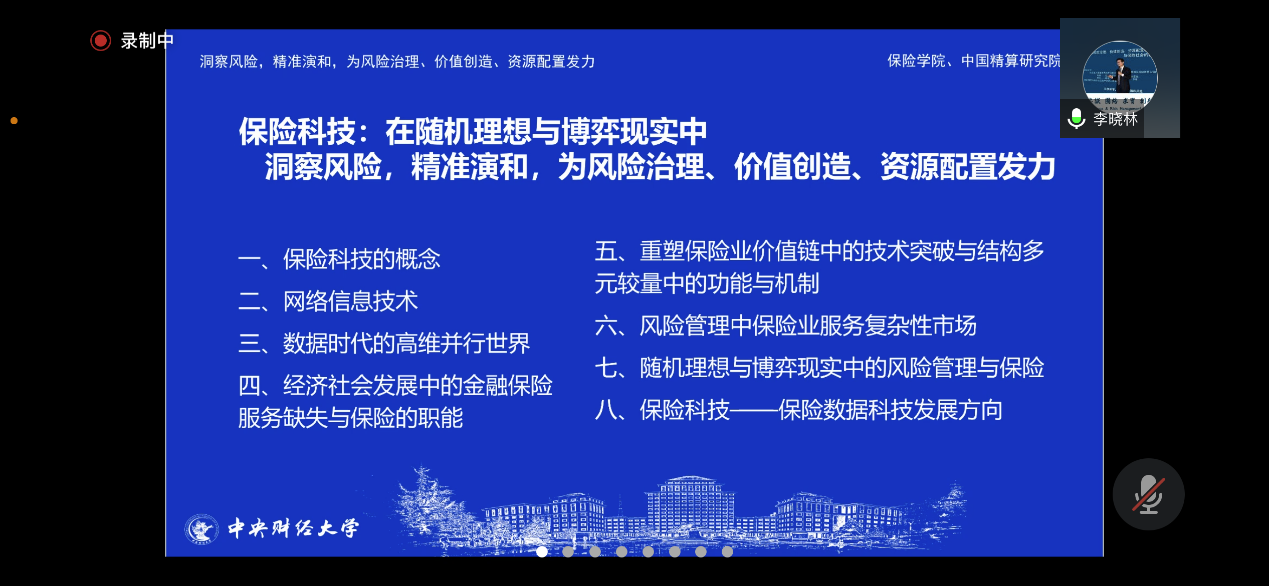 2022年3月3日,《保险科技》第一次课程由必赢nn699net官网院长李晓林教授主讲,题为《保险科技:在随机理想与博弈现实中洞察风险,精准演和,为风险治理、价值创造、资源配置发力》。李晓林院长以物联网、大数据、区块链、人工智能、云计算等新兴科学技术为切入点,全面深入地讲授了保险科技的诞生背景、发展现状、应用场景以及独特职能等。并且结合实际,强调保险科技对于重塑保险业价值链的关键作用。课程最后李晓林教授回答了课程负责人周桦教授提出的“科技引入如何改变保险业对经济社会发展的作用”这一问题,课程在热烈的讨论中圆满结束。