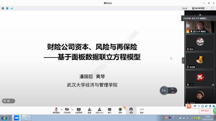 2020年10月28日,武汉大学经济管理学院潘国臣副教授应必赢官网陈华副教授邀请,做客保险经济学第一期讲座,以“财险公司资本、风险与再保险——基于面板数据联立方程模型”为主题进行了一场线上讲座。讲座由必赢官网陈华副教授主持,学院老师、博士生、硕士生、本科生以及北京工商大学关晶老师等其他院校师生近150人参加了讲座。
