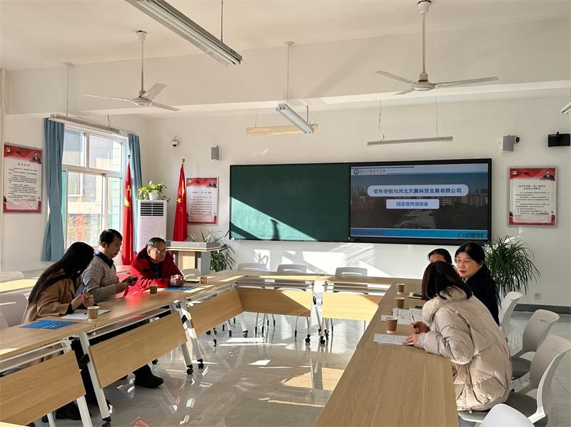 2024年1月3日上午,软件学院院长赵冬梅、校企合作与社会服务部长王俊昆、实践教学中心主任刘平、网络空间安全系主任尹益燕与河北天翼科贸有限公司总经理原伟、综合部经理王文青举行校企合作洽谈会。