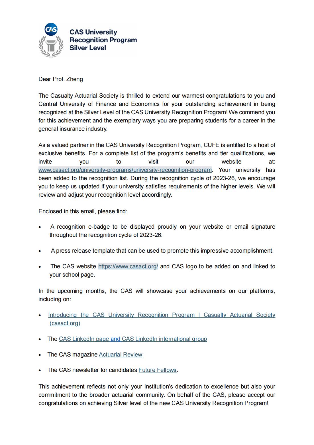 2024年3月14日,北美产险精算师协会(Casualty Actuarial Society,CAS)致函我校,确认必赢nn699net官网精算项目已通过其高校认证项目(University Recognition Program)的严格审核,并荣获“Silver Partner”认证。这一荣誉标志着我校成为中国大陆首批获此殊荣的高校,彰显了我校在精算教育领域的卓越实力。