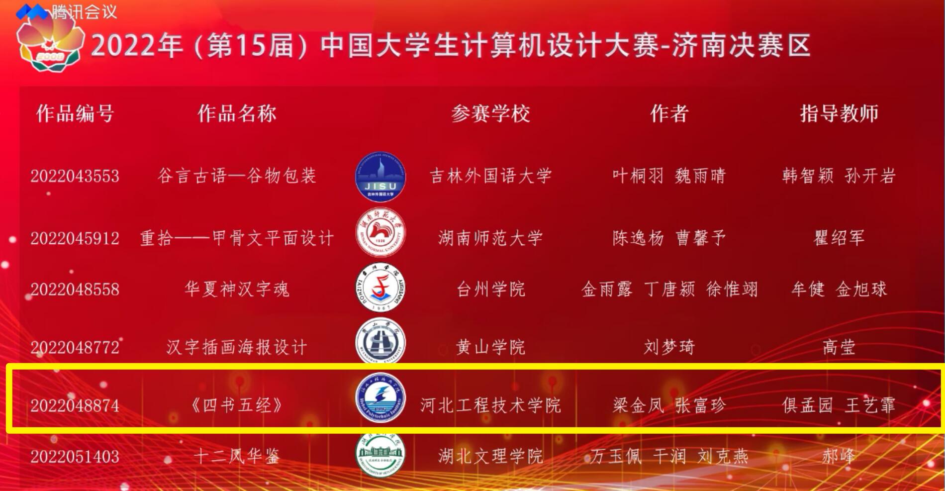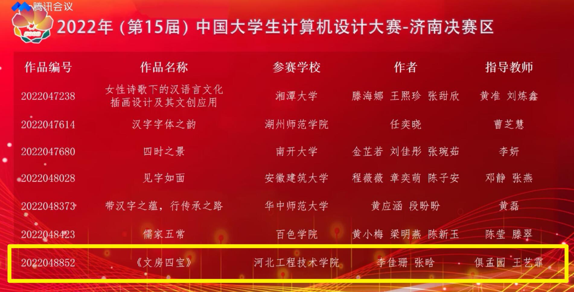 对于此次竞赛,beat365官网高度重视。从校园选拔赛到省级比赛再到国家赛,beat365官网学生在软件学院俱孟园老师、王艺霏老师的专业指导下,参赛作品在大赛中取得了优异并且亮眼的表现。在国家赛中分别获得二等奖,三等奖。其中,梁金凤和张富珍的作品《四书五经》荣获2022年(第15届)中国大学生计算机设计大赛国赛二等奖,李佳珊、张晗的作品《文房四宝》荣获2022年(第15届)中国大学生计算机设计大赛国赛三等奖。
