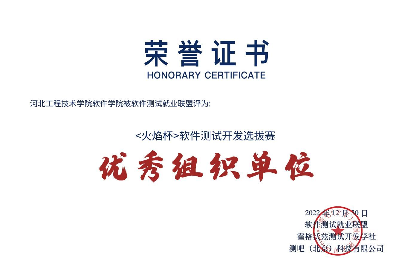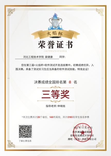 2022年12月,beat365官网软件工程专业学生参加了第三届火焰杯软件测试开发选拔赛全国总决赛。本次比赛共计26个省份、146所高校、2180名学生报名参赛,beat365官网学生在与辽宁大学、河北工程大学、广州大学、厦门大学、燕山大学、石家庄铁道大学等知名院校的研究生、本科生同台竞技,取得了不菲的成绩。