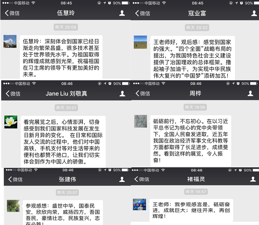 参观完展览后,老师们心潮澎湃,纷纷发来观后感,一位教工党员说:“十九大之后,国家将站在新的起点上。通过砥砺奋进的这五年,相信我们能共同实现两个一百年的伟大梦想!我们作为教育工作者,要将自己的工作职责与国家发展、民族复兴联系在一起,在自己的工作岗位上为了实现中华民族的伟大复兴贡献自己的光和热。”