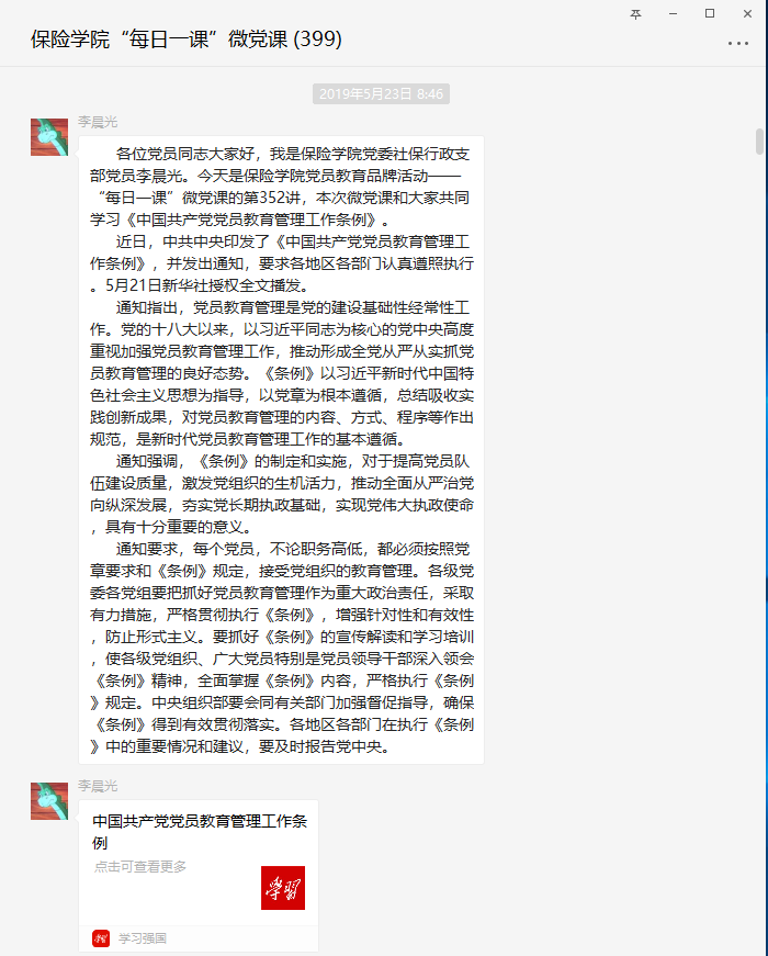 当天,学院纪委委员、社保系教师党员李晨光在“每日一课”微党课平台上就学习《条例》进行了宣讲,党员们也发表了自己的学习体会。