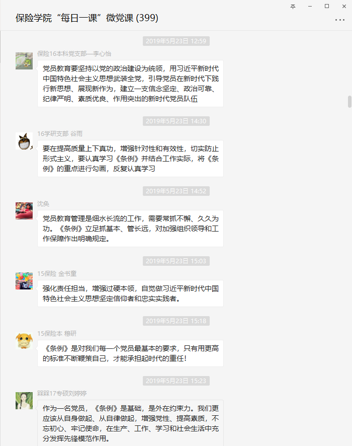 2017级专硕党员刘婷婷谈到:作为一名党员,《条例》是基础,是外在约束力。我们更应该从自身做起、从自律做起,增强党性、提高素质,不忘初心、牢记使命,在生产、工作、学习和社会生活中充分发挥先锋模范作用。