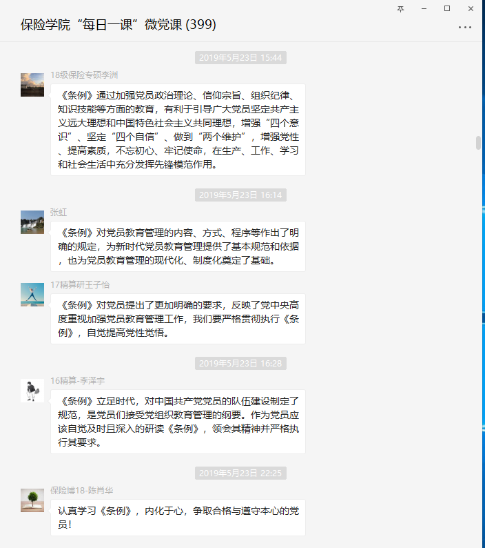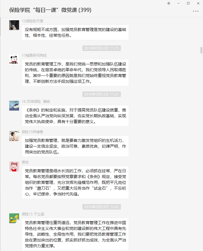 2017级保险研究生周悦谈到:党员教育管理是细水长流的工作,必须抓在经常、严在日常。每名党员都要按照党章要求和《条例》规定,接受党组织的教育管理,充分发挥先锋模范作用,既把平凡岗位当作“磨刀石”,又把重大任务当作“试金石”,不忘初心、牢记使命,争当时代先锋。