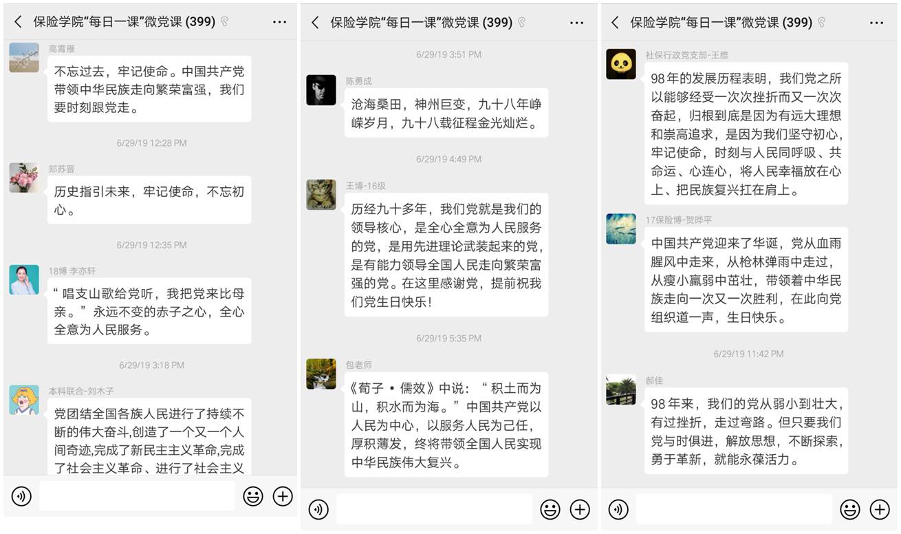 保险系党支部书记郭丽军谈到:中国共产党从诞生之日起就牢记全心全意为人民服务的根本宗旨,以坚定的理想信念坚守初心,牢记人民对美好生活的向往是我们的奋斗目标,时刻不忘我们党来自人民、根植人民,这是中国共产党永葆青春的基础所在。