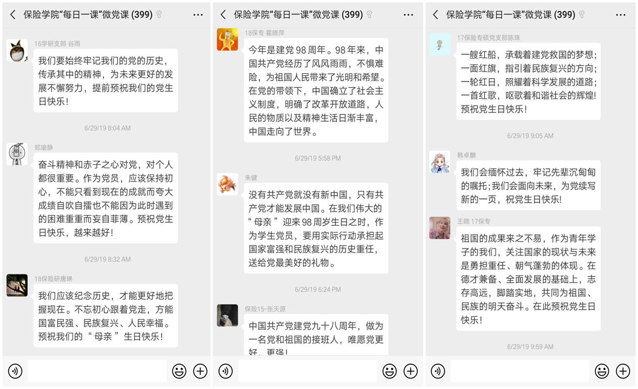 2017级保险专硕党支部书记王幸岚谈到:建党98年来取得的伟大成就和我们今天的幸福生活,是英勇献身的老一辈革命家和烈士们用鲜血换来的,我们作为青年党员要经受住新时代的考验,不断千锤百炼、勇挑责任和担当,以老一辈党员同志为榜样,真正做一名为人民服务的合格党员。