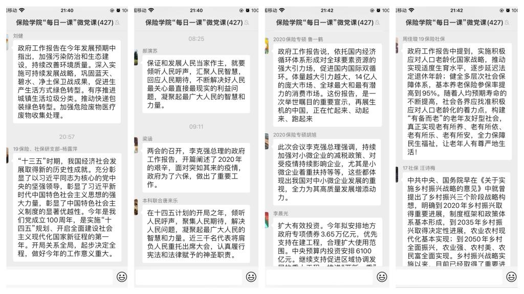 本科生第一党支部喇新悦:从政府工作报告中,我们可以看到国家对维护社会繁荣稳定的决心,对国家经济快速恢复的信心,对廉政建设一如既往的坚定,对民生工作无微不至的关心。今年我们喜迎建党百年,中国取得的成就离不开以习近平同志为核心的党中央的坚强领导,站在新的历史起点上,我们更应该不忘初心、继续前进。