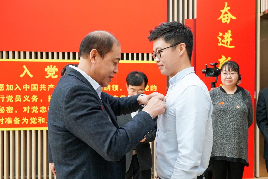 老党员为新党员佩戴党员徽章