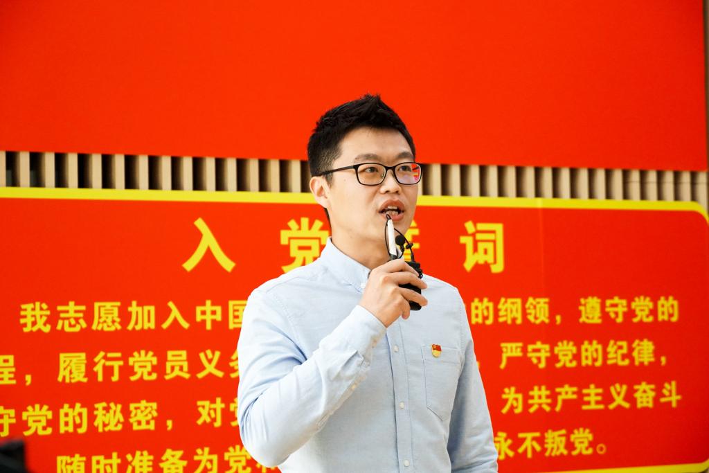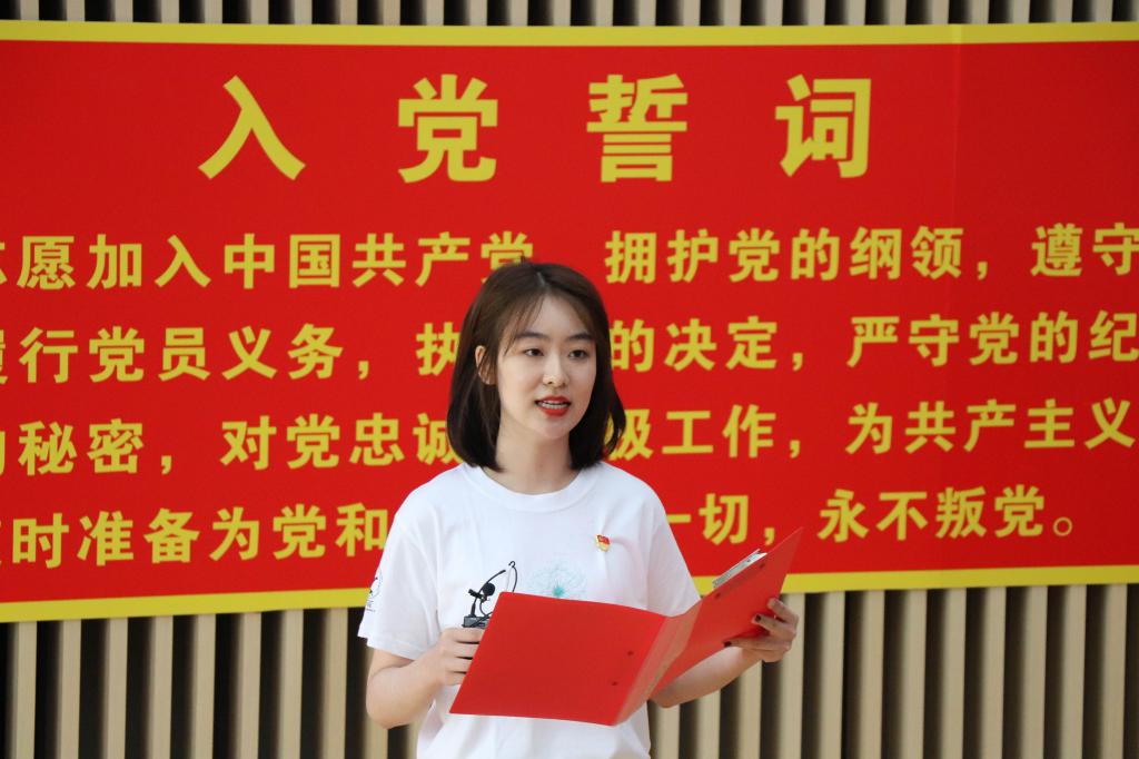 鲜红的党旗,映射着党员们内心对党的热爱与忠诚,在这个庄严的仪式中,新加入党组织的党员代表、青年教师马冰将对党的热爱付诸演讲之中,满怀激情的发表感言。新加入党组织的学生党员代表闫诗琪分享了党史上第一篇入党誓词的故事,每一句誓词的历史见证了中国共产党人前赴后继、不怕流血牺牲的奋斗史,也使得在场的党员们进一步明确了初心使命。
