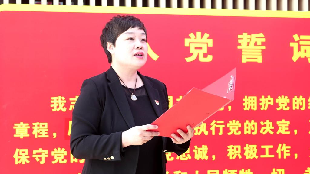 面对庄严的党旗,新党员代表青年教师马冰领誓,新党员们面向党旗举起右拳,郑重宣誓。铮铮誓言,响亮有力,字字千钧,宣告着每位党员即将担负起一生的光荣使命,也鼓舞着在场所有青年学子。