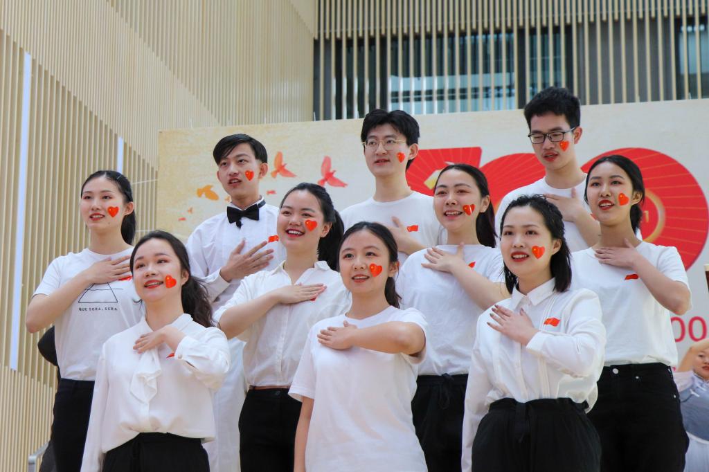 在入党宣誓仪式圆满结束之时,一场“红心向党、红色快闪”拉开帷幕。“唱支山歌给党听,我把党来比母亲”,一句婉转而又亲切的歌声响起,仪式现场顿时化作合唱现场,阶梯上的合唱团将对党的赤诚之心融入音符,舞者把党的峥嵘岁月笼进红纱,现场的师生党员随着韵律挥动着党旗和国旗,无一不被此情此景所触动。“没有共产党就没有新中国”“我们都是追梦人,在今天勇敢向未来报到”“财经黄埔人,永远跟党走”,青春的舞步带着蓬勃朝气点燃全场。