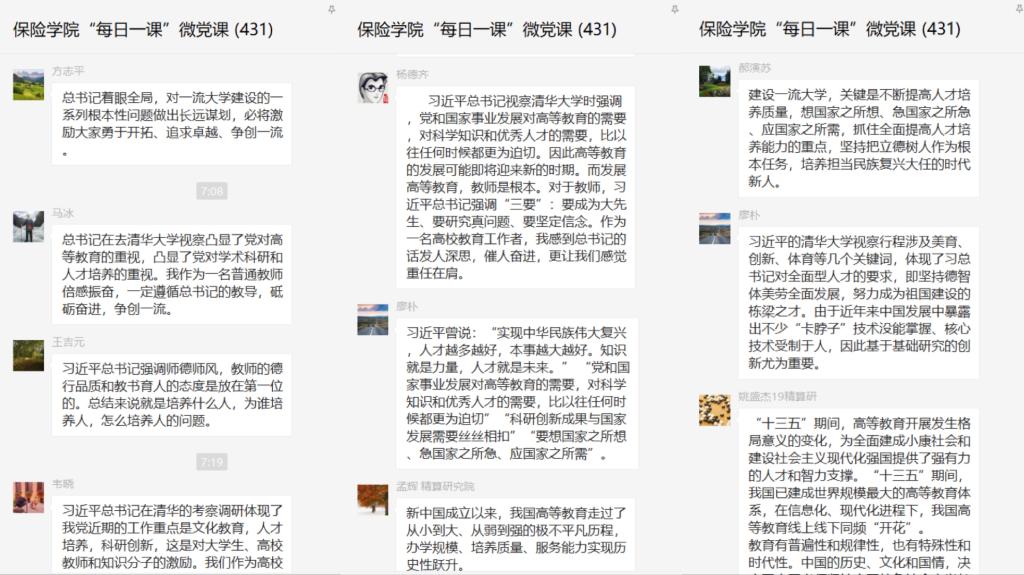 保险系教工党支部党员马冰:总书记在去清华大学视察凸显了党对高等教育的重视,凸显了党对学术科研和人才培养的重视。我作为一名普通教师倍感振奋,一定遵循总书记的教导,砥砺奋进,争创一流。