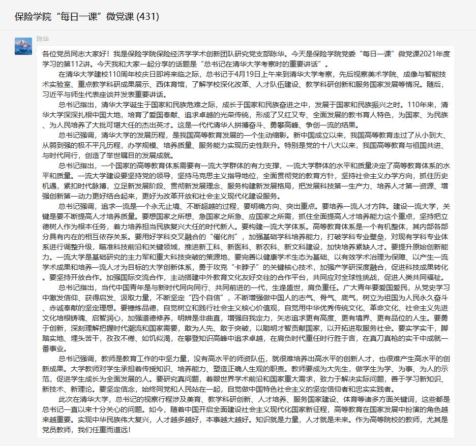 学院党委理论中心组第一时间开展学习,中心组全体成员认真观看习近平总书记在清华大学考察的新闻视频资料,全体成员交流学习体会。学院召开党支部书记学习交流会,各党支部书记共同学习习近平总书记重要讲话精神,进行交流分享。4月22日,在必赢nn699net官网“每日一课”微党课学习平台上,由保险经济学学术创新团队研究生党支部书记陈华老师进行题为“总书记在清华大学考察时的重要讲话”的微党课宣讲。他表示,此次在清华大学,总书记的视察行程涉及美育、教学科研创新、人才培养、服务国家建设、体育等诸多方面关键词,这些都是总书记一直以来十分关心的问题。如今,随着中国开启全面建设社会主义现代化国家新征程,高等教育在国家发展中扮演的角色越来越重要。实现中华民族伟大复兴,人才越多越好,本事越大越好。知识就是力量,人才就是未来。