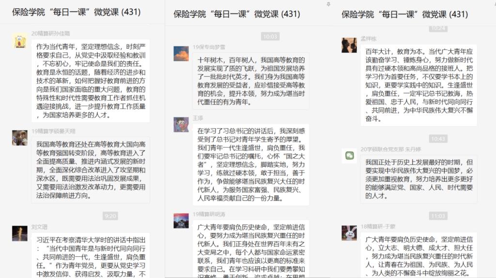 2019级保险专硕党支部书记王一航:习近平总书记在清华大学的讲话令人深思,催人奋进。在高等教育不断推向前进的今天,我们每一个莘莘学子都需要思考教育的意义,在感慰于自身努力和奋斗时,更需要感恩时代和国家的馈赠,从而多一分责任和担当,服务社会,服务人民。作为一名研究生党员,我们应牢记习近平总书记嘱托,在攀登知识高峰中追求卓越,在肩负时代重任时行胜于言,在真刀真枪的实干中成就一番事业。
