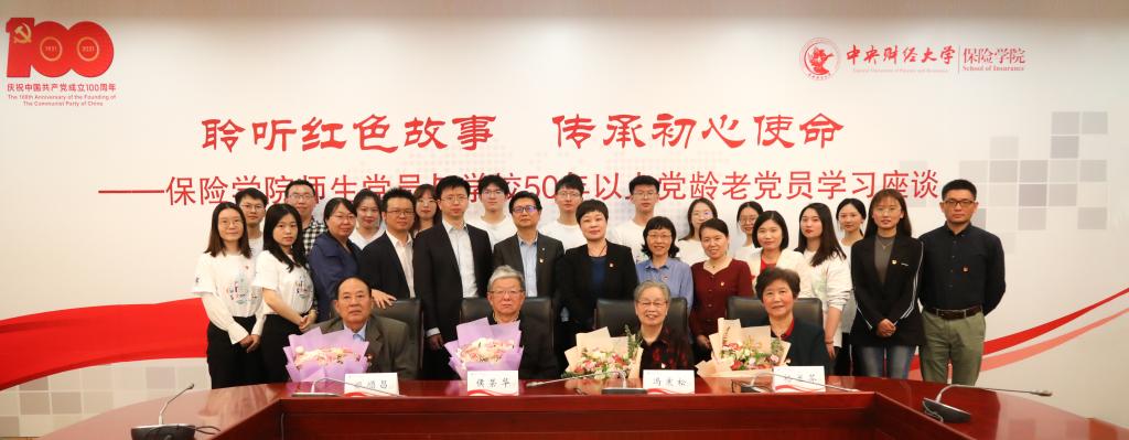 近九旬高龄的侯荣华教授回顾了自己在中财四十多年研学创新、教书育人的时光,他总结自己四十多年的体会与感悟,送给在座的新党员八个字:“向上、学习、创新、实干”。他表示,耄耋之年忠诚在,牢记使命勇向前。在建党100周年前夕很荣幸能和新党员们一起座谈,祝贺新党员们加入中国共产党。这八个字是对大家的希望和祝福,希望新党员们能拥有蓬勃向上的朝气,鼓足干劲、力争上游;能不断学习充实自己,通过政治学习保证方向,业务学习注重思考,打好落实初心使命的基础;能不断创新,精研学术,在知识淘汰率较高的时代里常学常新;能实干实学,空谈误国、实干兴邦,希望新党员通过不懈努力干出一番事业,成为保险方面的拔尖人才,为党为国奉献。