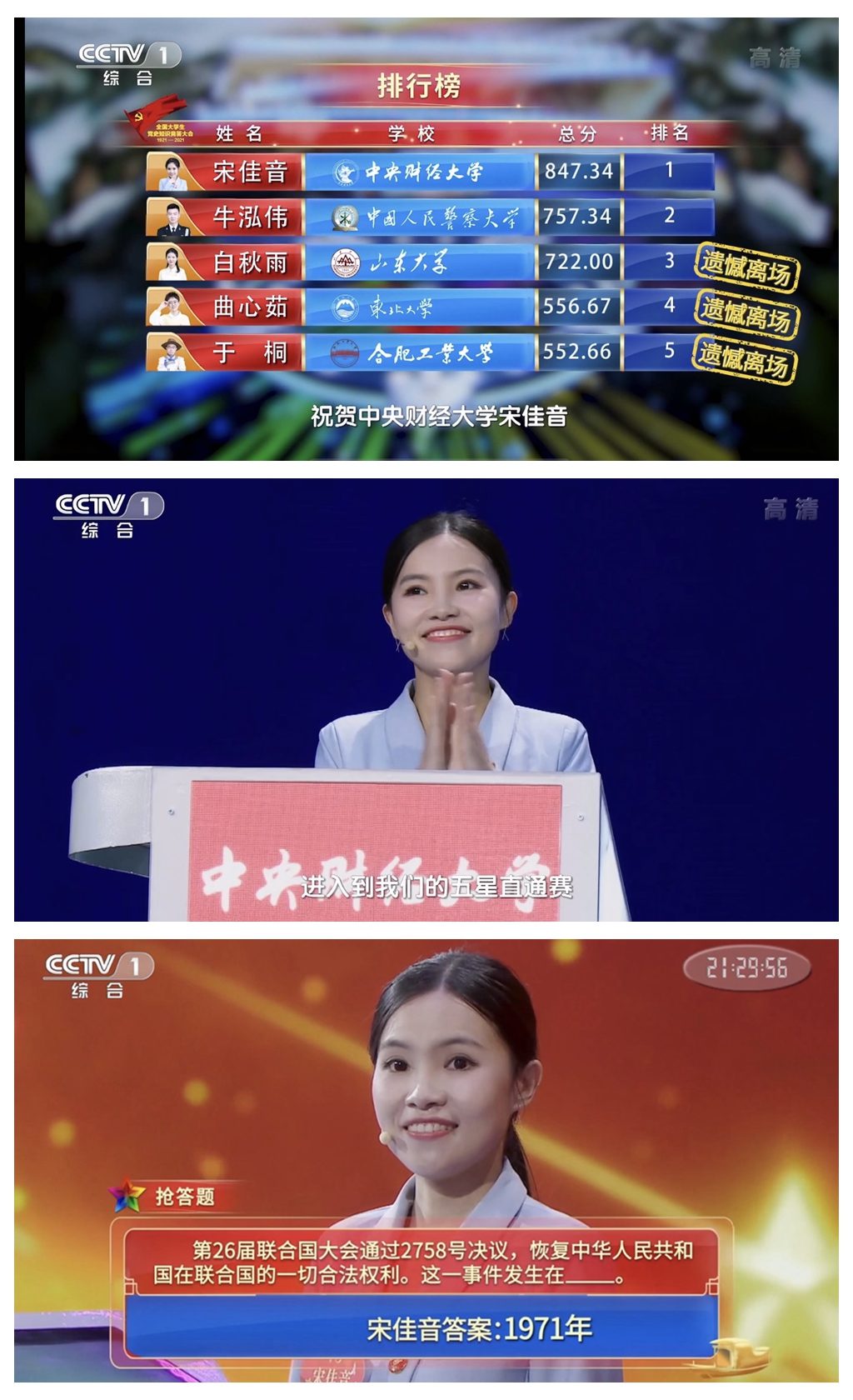 必赢nn699net官网2019级保险专硕研究生宋佳音登上CCTV-1,代表必赢nn699net官网出战,与全国100所高校的100名在校大学生,参与现场竞答,在紧张激烈、环环相扣的比拼中,学习党史,经受理想信念的深刻洗礼。在第五期节目“五星抢位赛”中,宋佳音凭借优异表现成功冲出“百人团”,顺利登上节目主舞台,并最终进入到了“五星直通赛”环节。