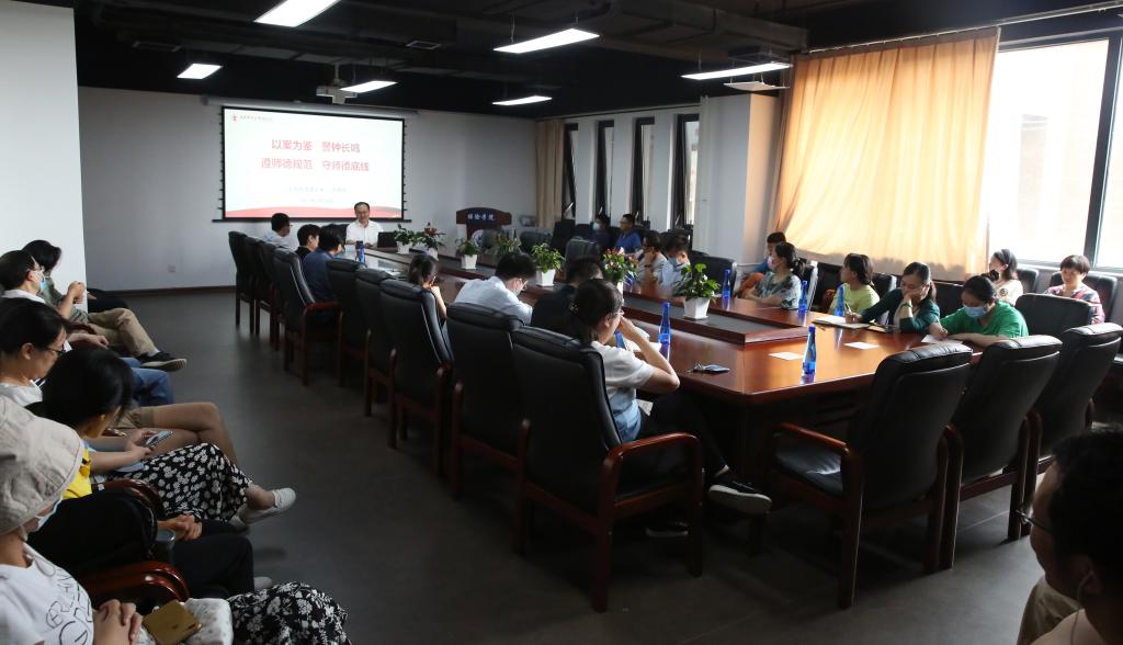 为了深入落实新时代教师队伍建设改革要求,进一步加强师德师风建设,弘扬师者德为先的师德风范,塑造教师良好形象,营造廉洁从教、规范从教的氛围,树立教师队伍良好风貌,2021年7月14日,必赢nn699net官网在学院楼13号楼215会议室召开师德师风警示教育大会,邀请到北京外国语大学原纪委副书记刘培元老师,进行题为《以案为鉴,以案明纪;遵师德规范,守师德底线》的警示教育讲座,与会人员在会后进行了学习交流。会议由必赢nn699net官网党委书记王颖主持,学院全体教工参加。