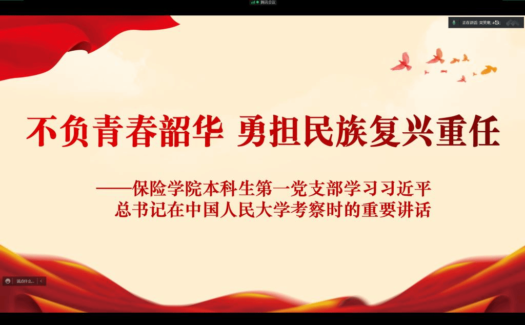 学深悟透强思想,初心使命记心间。毕业季来临之际,必赢nn699net官网本科生第一党支部党员坚持政治思想毫不松懈,学习主题紧跟时政,认真研学习近平总书记在中国人民大学考察时的重要讲话、习近平总书记在庆祝中国共产主义青年团成立100周年大会上的讲话等重要文件,掀起学习贯彻习近平总书记重要讲话精神的热潮。支部党员通过校内校外观看直播、主题党课学理阐释、线上线下思悟分享等形式,学习领悟习近平总书记重要讲话的主旨要义、丰富内涵和实践要求,深刻理解习近平总书记对青年一代的寄望之深、对青年成长的教导之切,进一步坚定理想信念,增强党性修养,传承红色基因,保持党员初心。