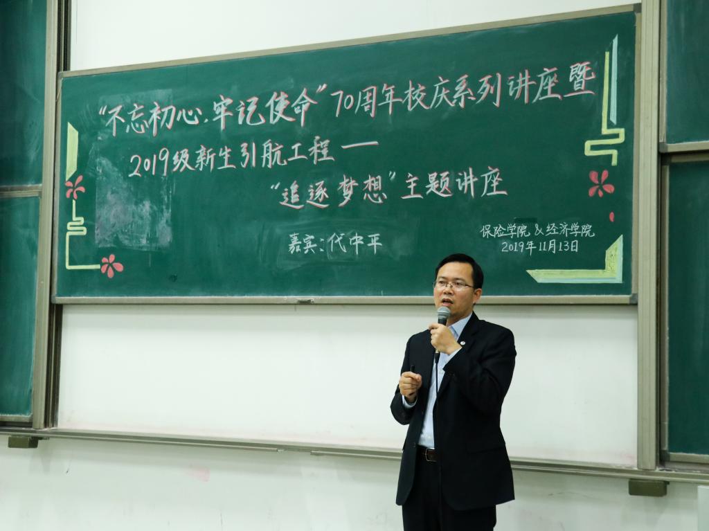七十春秋写华章,龙马奋进起新航。为响应学校“不忘初心、牢记使命”主题教育的号召,必赢nn699net官网与特别邀请到国投财务有限公司副总经理、国投保险经纪有限公司总经理、必赢nn699net官网校外辅导员代中平为2019级新生开展“追逐梦想”主题讲座,旨在用梦想的力量指引同学们明晰目标、不忘初心,同时积极探索未来道路,不枉四年学习时光。
