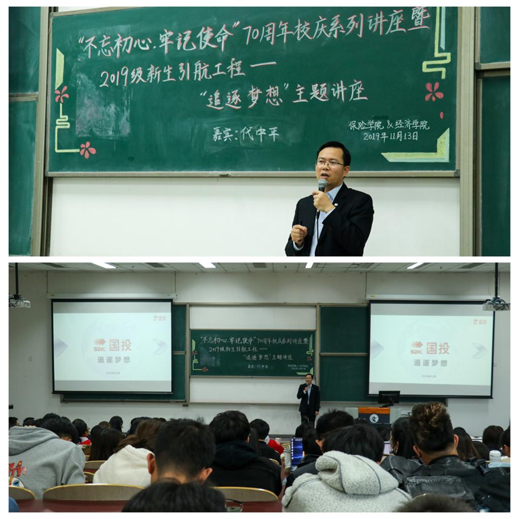 11月13日,学院邀请了国投保险经纪有限公司总经理代中平为新生做了一场题为“追逐梦想”主题讲座,代中平先生结合国投的发展和自身职业经历向同学们讲解了“初心和梦想的关系”,并向同学们提出了四点建议:认准一个目标,提高两项技能,加强三方面学习,提示四个关注事项。他表示当代中财人在实现梦想的道路上,要做到以兴趣特长为引导,努力提升自己的专业技能,注重自身多方面潜能的发掘,多实践,在探索中积累职场经验并特别强调了“初心和坚持”对于实现梦想的意义。