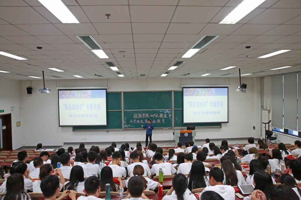 开学典礼后,院长李晓林教授为新入学的研究生们进行了一场别开生面的“院长谈治学”专题讲座。李晓林教授用自己的亲身经历告诫同学们要明确自身肩负的责任,立志于学,充分认识保险、精算和社会保障体系的重要性,妥善处理各方面的关系,在不断的实践、创造和奉献中获得成长;告诫同学们要紧跟时代发展,深刻认识风险演化规律,为时代做出自己的贡献。