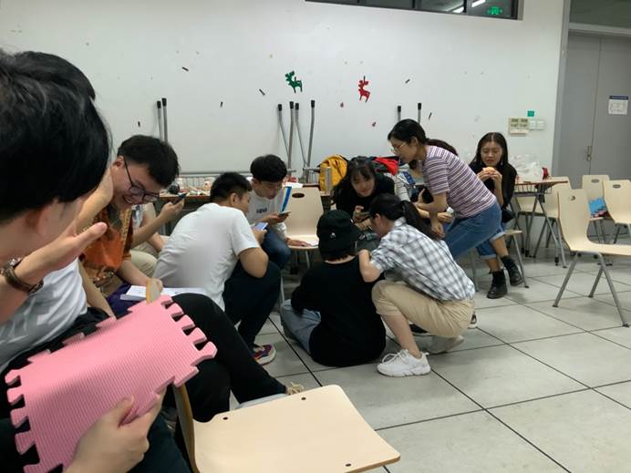 破冰活动的第一环节是自我介绍接龙,大家使用互不相同的形容词介绍自己和另一位同学,大家绞尽脑汁想出了各种稀奇古怪的形容词来整蛊,在欢声笑语中增进了了解。接下来进入游戏环节,第一个游戏是黑暗队列,所有同学在不发出任何声音的前提下,通过肢体语言按生日从大到小进行接龙排成一只长队伍,在经过10分钟的“交流”中,大家成功排队,没有出错。接下来大家分为3组,进行第二个游戏-同舟共济。每队发放7块拼图地毯,每组成员争取使用最少的拼图让所有成员站在拼图上。最后每组成员都成功以2块拼图完成任务。第三个游戏是急速60秒,每组成员依次派1名代表去观察24张含有数字信息的图片,并排列出正确的顺序,每个代表有60秒的时间。在所有成员都完成观察和排序后,最终有一个小组成功没有错误的完成任务。最后一个游戏-驿站传画,每组派出一名代表上前看词卡,然后以画画的形式传递信息给下一个人,接下来的人依次画画传递信息,最后的同学负责猜出词条。在大家的“优秀”画工下,每组最后的同学给出了各种意想不到的答案,在答案公布后场下更是爆笑如雷,大家互相欣赏各自的画作,讨论自己理解的词,场面充满了欢乐的气息。