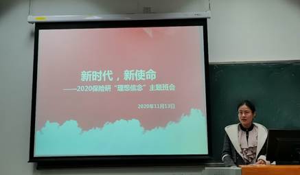 为深入学习习近平新时代中国特色社会主义思想,引导同学们在新时代背景下树立新使命,形成方向正确、目标明确、执行有力的理想信念,2020年11月13日下午,2020级保险学研究生开展了以“新时代,新使命”为主题的“理想信念”主题班会。本次班会由朱丹婷同学主持,共分为理论学习与交流分享两个部分。