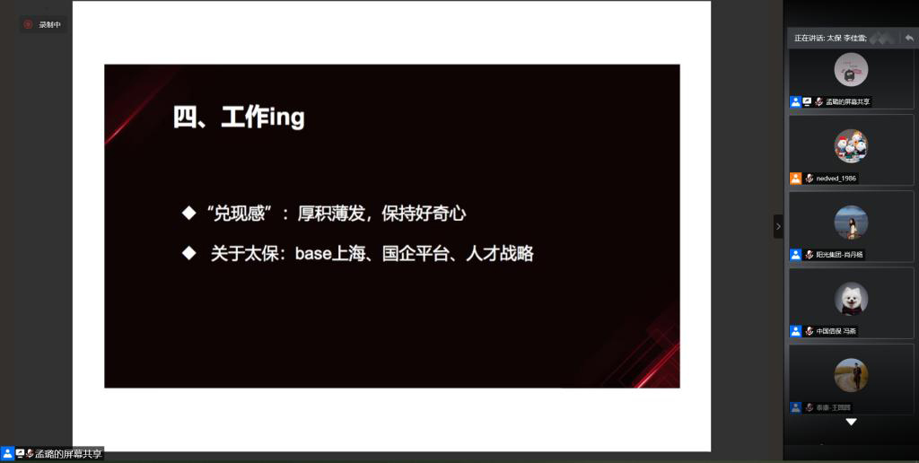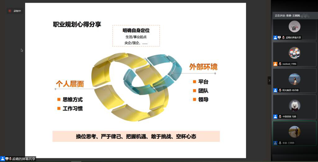 接着,目前就职于泰康保险的2016保险研王圆圆学姐分享了自己在泰康的求职与工作经历,并就外部环境层面分析了在求职过程中应当如何选择,就个人层面分析了如何培养自己的求职竞争力以及在日常工作中应有的品质。学姐认为在外部环境层面中,选择部门非常重要,因为部门是发展的基础和平台。其次,团队也非常重要,如果一个团队具备较高的默契程度和积极向上的氛围,愿意教导、信任新人,并交给新人重要的工作,新人可以获得非常快速的成长。在个人层面上,学姐认为大家应当拥有良好的工作习惯与好的思维方式。工作习惯可以在工作过程中在前辈的教导下形成,但思维方式需要自己培养。最后,学姐向同学们提出了工作中的五点建议:换位思考、严于律己、把握机遇、敢于挑战、空杯心态。