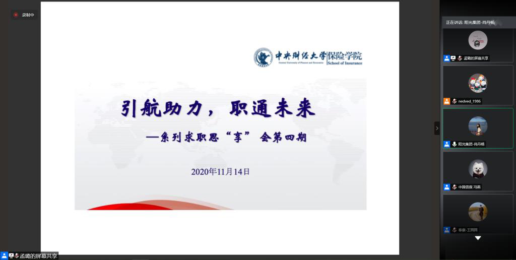 2020年11月14日晚上七点至九点,由必赢nn699net官网举办的“引航助力,职通未来”系列求职思“享”会第四期通过腾讯会议的方式在线上顺利举行。本次会议邀请到了就职于阳光保险的2016保险专硕肖丹杨、泰的保险2016保险研王圆圆、太平洋保险2016精算研李佳雪和中国信保2017精算研冯燕为同学带来了一场精彩的学习、求职经验分享。